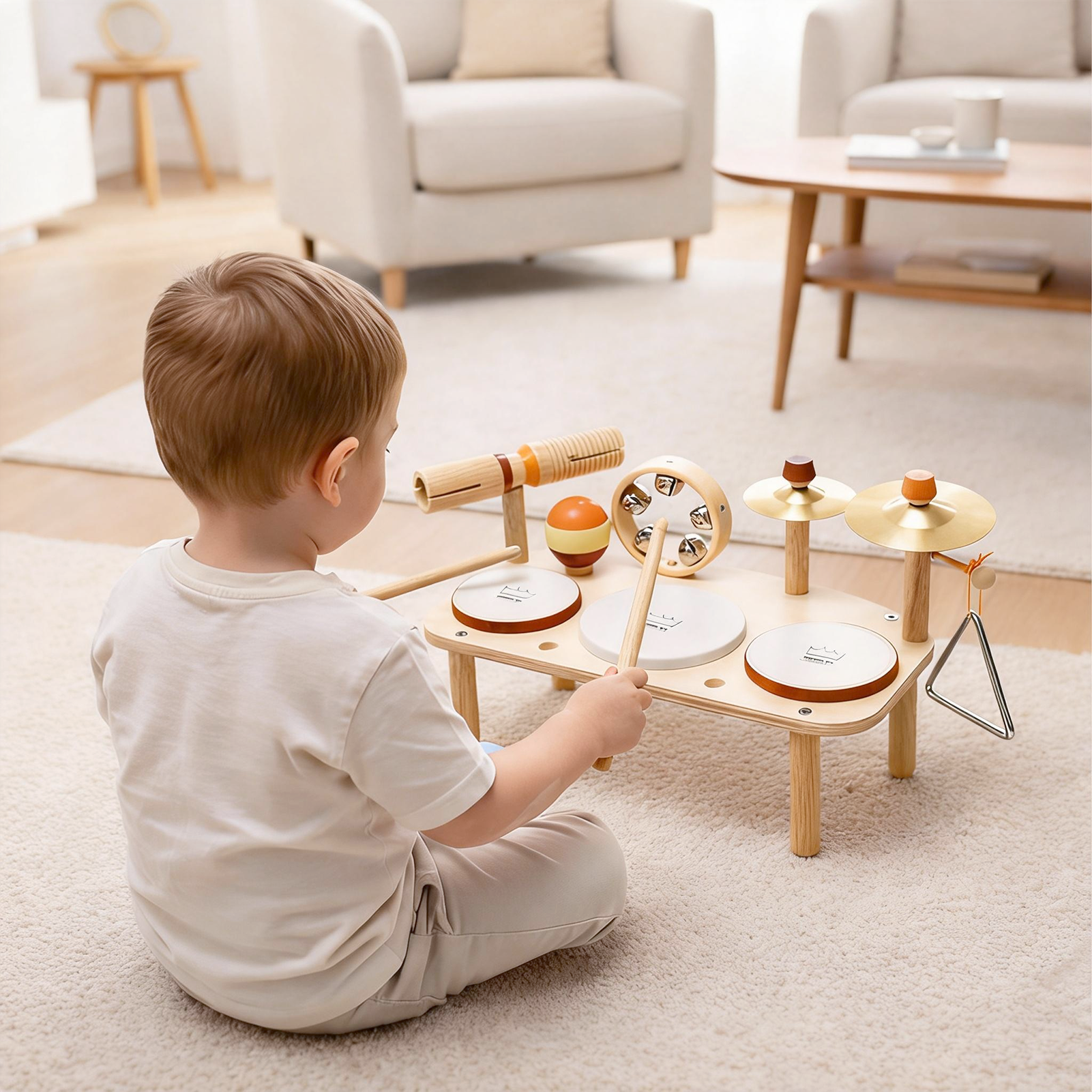 A compact and engaging Joyreal montessori drum set for toddlers, designed to inspire joyful music play and early learning through a beautifully crafted montessori music set.