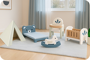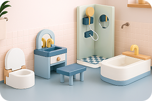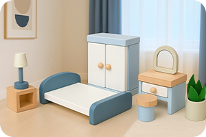 Our wooden dollhouse furniture set is an eco-friendly, 36-piece wooden toy. Made from durable, non-toxic wood, it includes five rooms (living room, dining room, kitchen, bathroom, and bedroom) and four posable family dolls. This set promotes creativity, fine motor skills, and imaginative play, making it the perfect gift for young kids who enjoy wooden toys and role-playing.
