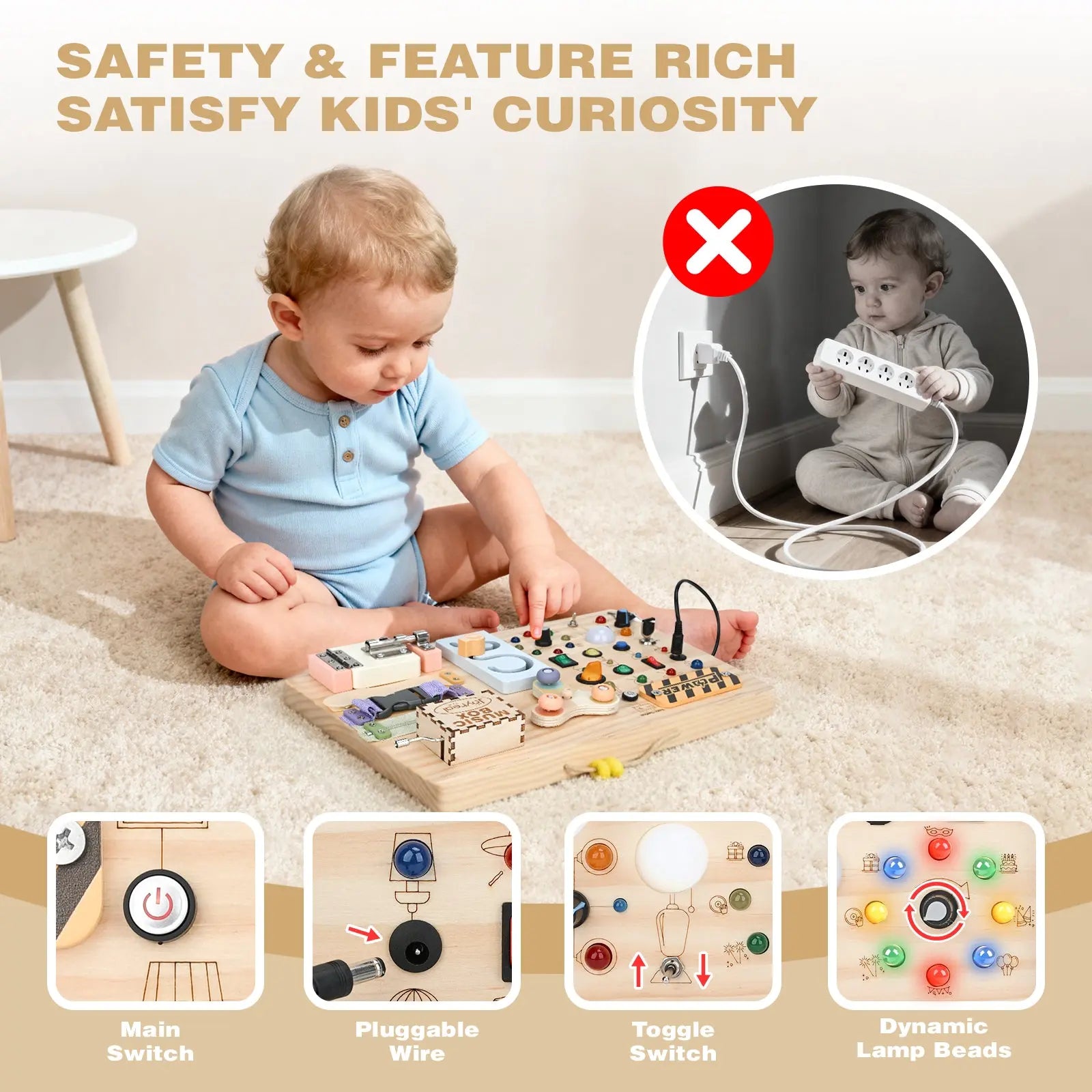 Montessori Board with Lights and Music: Combines sensory fun and learning as toddlers flip switches, press buttons, and play the hand-cranked music box to explore focus, curiosity, and imagination.