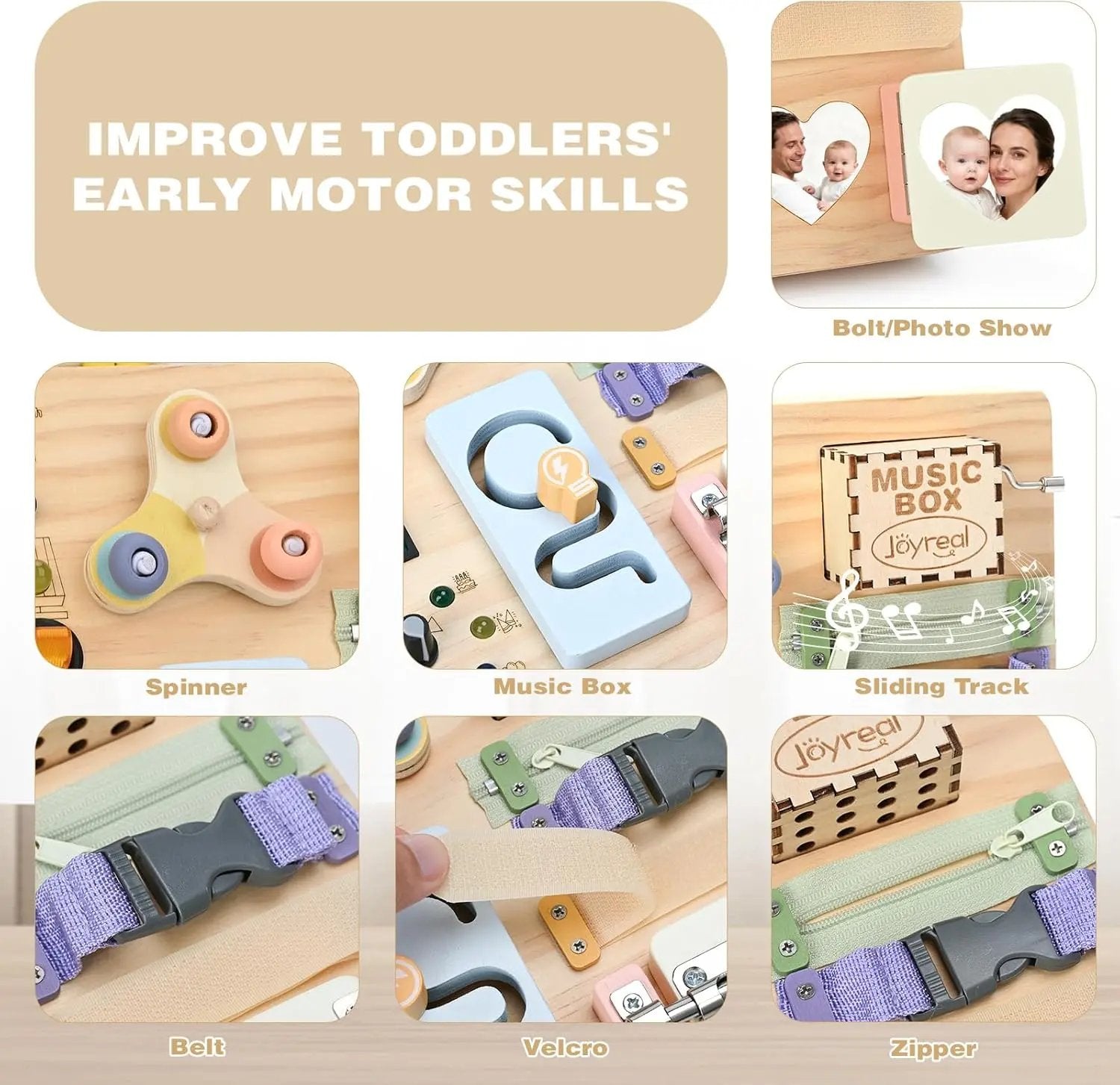 Montessori Board with Lights and Music: Combines sensory fun and learning as toddlers flip switches, press buttons, and play the hand-cranked music box to explore focus, curiosity, and imagination.