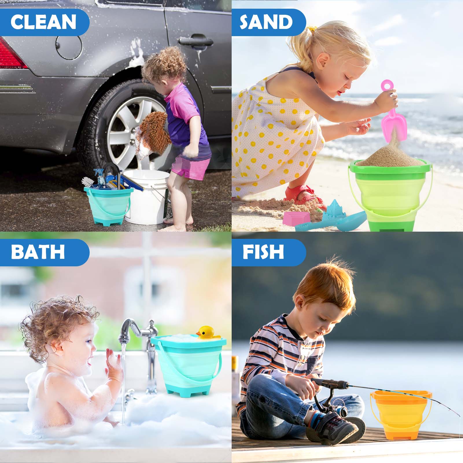 Collapsible buckets fold flat for easy packing, ideal for travel, beach vacations, and outdoor adventures. -